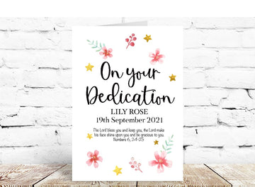 A baby dedication card is a card given to the parents of a newborn baby. The card is usually given by the godparents, grandparents, or other close relatives and friends of the family. The card may be personalized with the child's name and date of birth, as well as a special message from the sender.