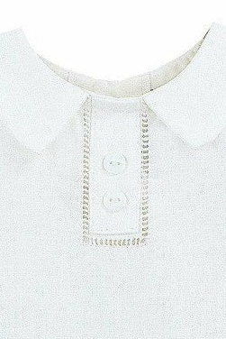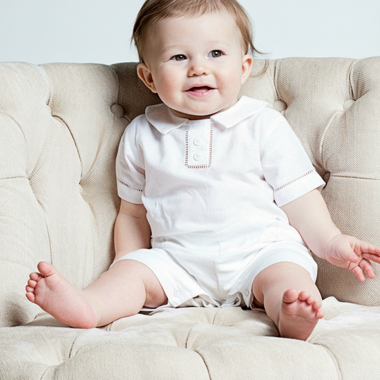 Looking for a beautiful boy's outfit to wear in the warmer months? Look no further than Carriage Boutique. This Formal Baby Boy Romper features a linen and cotton blend, giving it a very elegant and high-quality look.