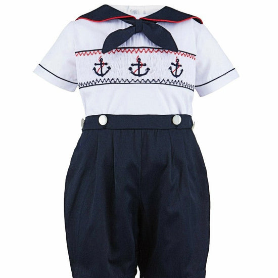 Made with high-quality materials, this suit is perfect for those who want a suit that will last longer than one season. In addition to its stylish sailor collar, this suit features hand smocked anchors on the front. Whether you're heading to a formal event or just want to look stylish, this suit is perfect for you.