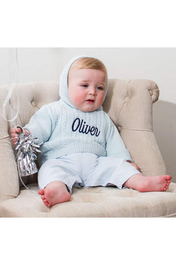 Classic style with modern comfort for your little one. This charming baby blue cable-knit sweater is crafted from ultra-soft, breathable cotton—perfect for cooler days and cozy moments.