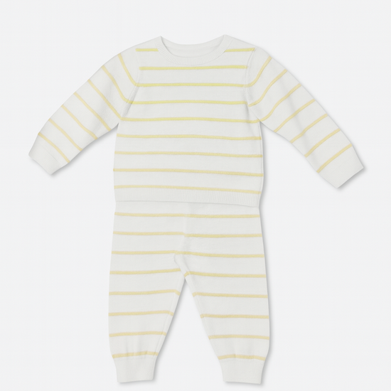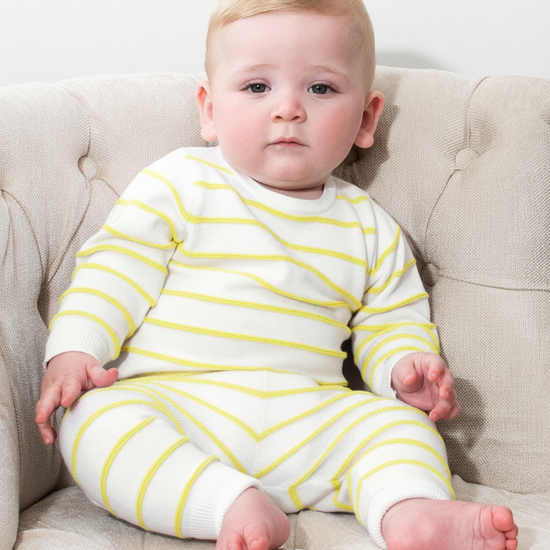 Wrap your little one in cozy cuteness with our Snuggle Stripe Two-Piece Set! This adorable outfit features a soft knit fabric in a creamy white base, delicately kissed with yellow stripes for a timeless, picture-perfect look. The long-sleeve top and matching pants are designed for all-day comfort—perfect for tummy time, nap time, or a stroll in the park. With stretchy cuffs and a comfy waistband, it's an easy-on, easy-off dream for busy parents and wiggly little explorers.